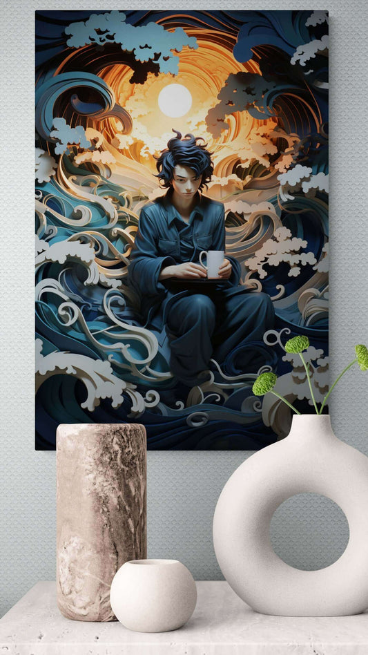 Contemplation on the Waves: Japanese-Inspired Layered Paper Fantasy Canvas Wall Art