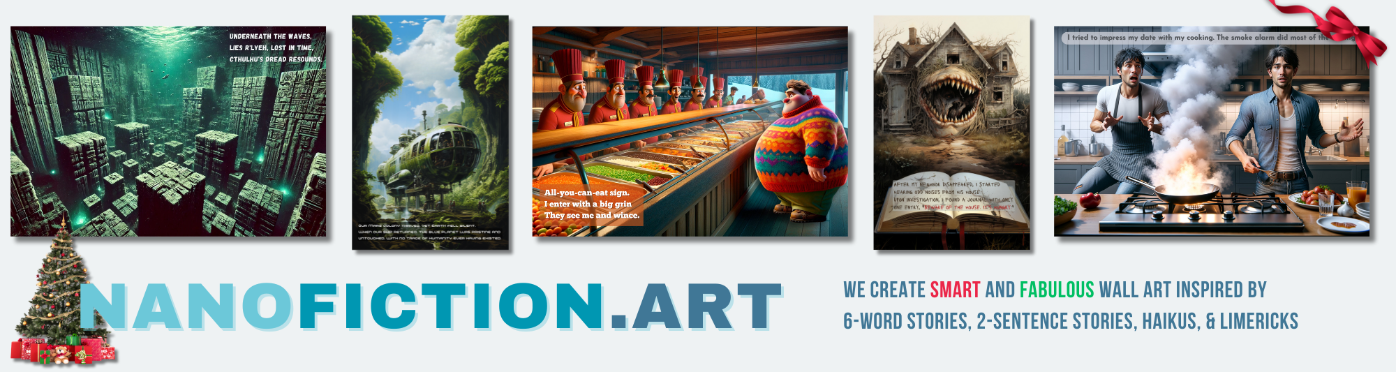 Each piece of nanofiction inspires a stunning work of wall art, turning these brief tales into captivating, tangible masterpieces.