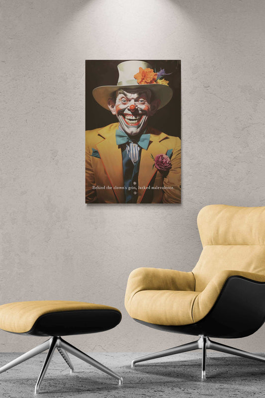 The Sinister Grin: Vibrant Clown Canvas Wall Decor with Chilling 6-Word Story