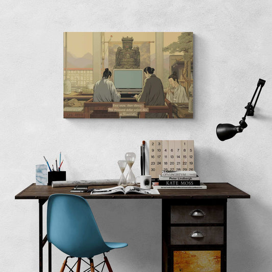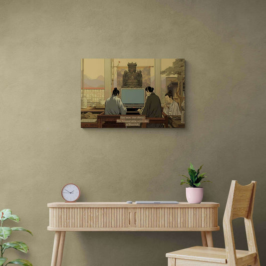 Zen Tech Snowfails: Traditional Chinese Landscape Canvas Wall Art with Tech Anachronism Haiku