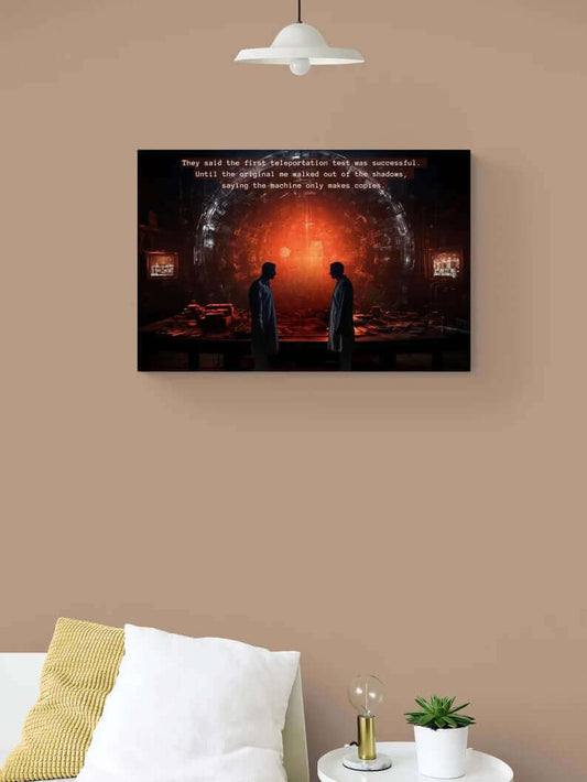 Quantum Quandary: Riveting Sci-fi Horror Canvas Wall Art with Sinister 2-Sentence Story