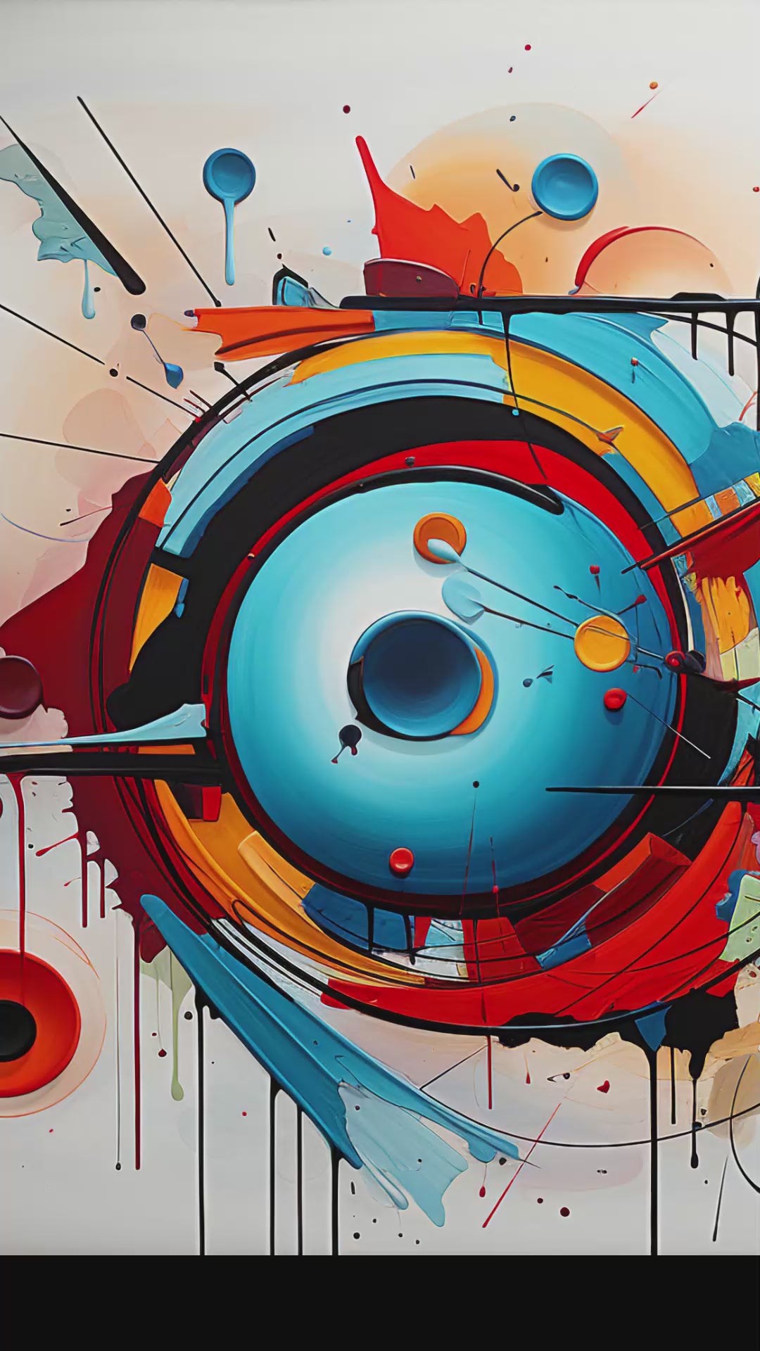 At the center, an abstract sphere emerges from a swirling maelstrom of sprays and drips, evoking the intensity of street art while adding a touch of surrealism. The intricate details, from vibrant dots to the trompe-l'Åil effect of dripping pens, draw viewers into a visual cyclorama, offering new perspectives with every glance.