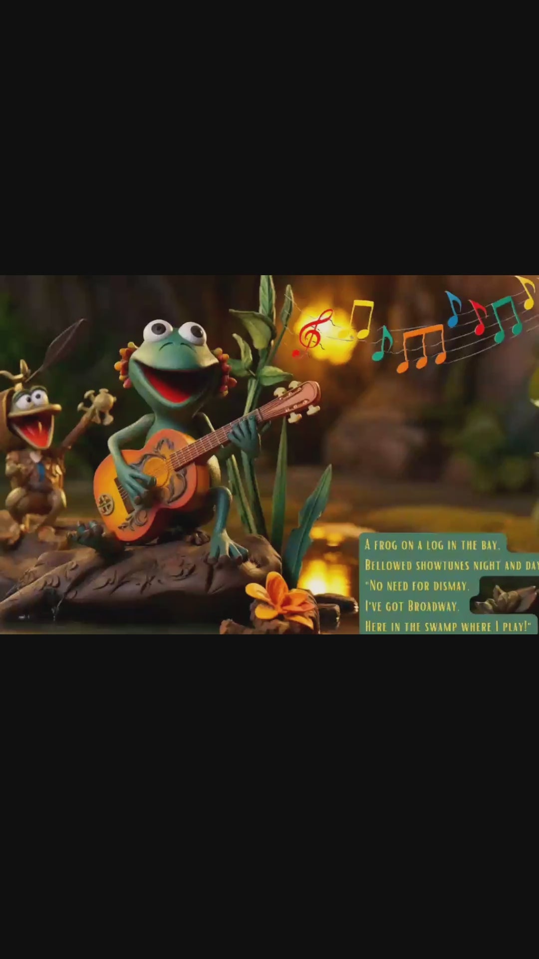 Whimsical Imagery: Cartoonish Claymation-style frogs performing show tunes bring a nostalgic and lively feel.